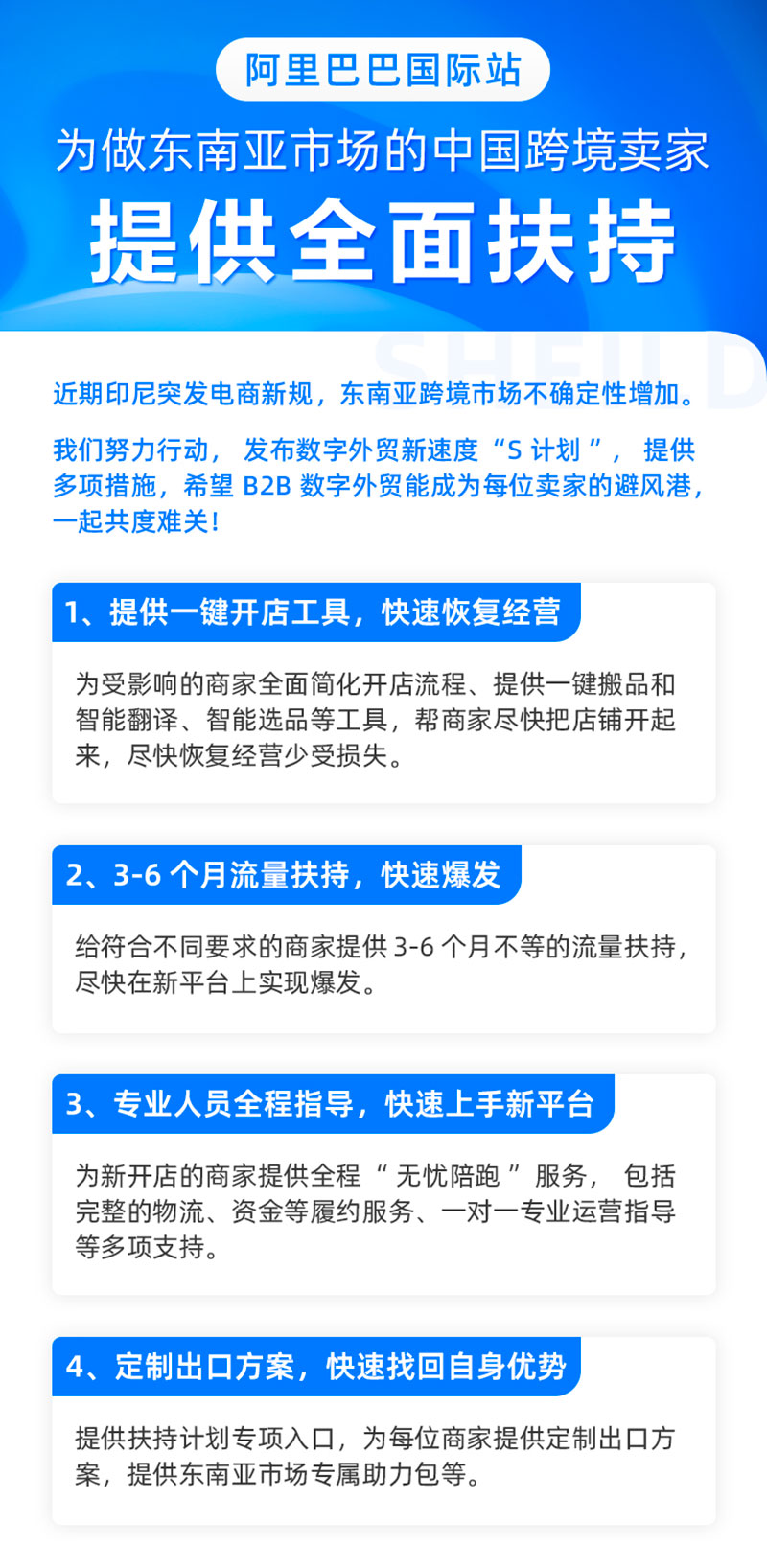 3.结合东南亚市场情况,帮助定制出口方案。阿里国际站将通过扶持计划专项入口,为每位商家提供定制出口方案,提供东南亚市场专属助力包等。