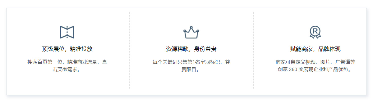 是将产品和企业信息通过视频、文字和图片等富媒体形式全方位展现在买家面前,位于搜索结果首页的位,是展示企业品牌实力的有效推广模式。