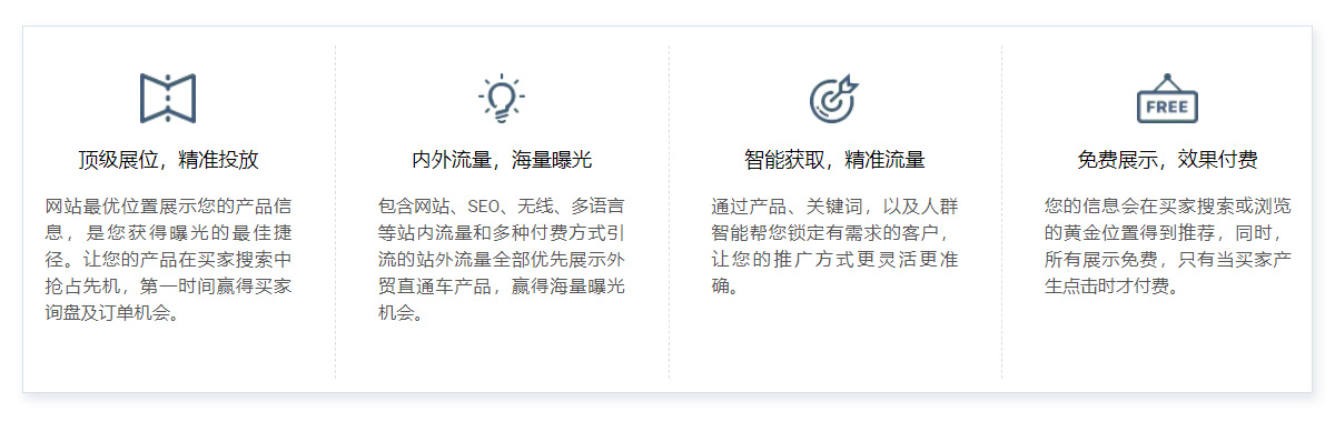 是一种按照效果付费的网络营销服务。通过优先推荐的方式,将您的产品展示在买家搜索的各种必经通道上。